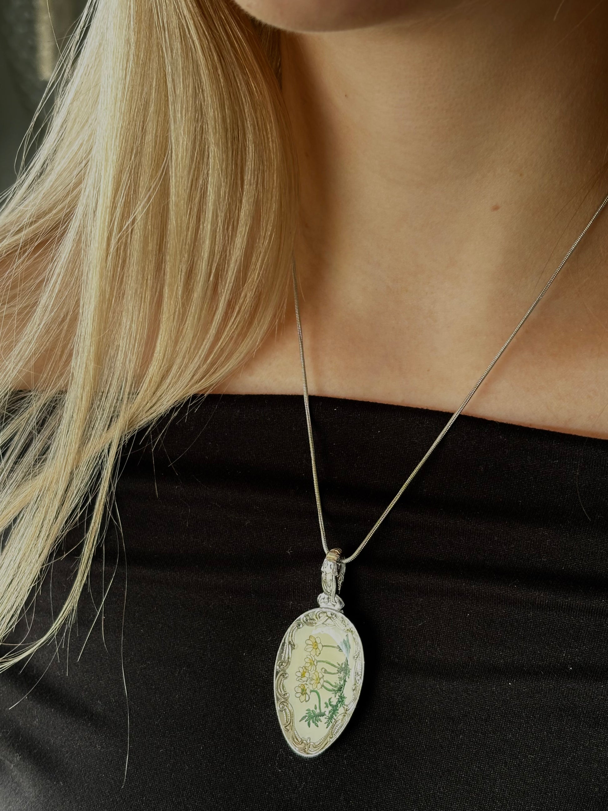 Spoon pendent handcrafted from collector spoons. Flower field stainless steel pendent, with a 20inch stainless steel snake like chain
